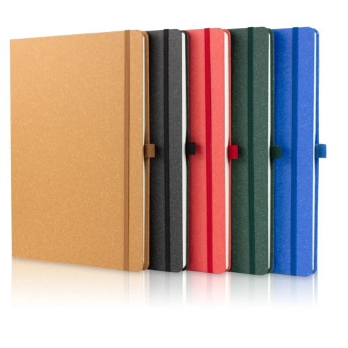 Sustainably-sourced A4 notebook in five colours. The cover is manufactured from recycled FSC certified board and covered with thermal paper to enable your logo to be debossed, avoiding the need for ink. Supplied with 196 pages of 80gsm Ivory lined FSC certified paper and a colour matched ribbon, pen loop and elastic closure.