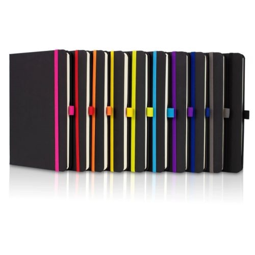 This black A5 Notebook has a soft touch thick PU cover perfect for a deeper debossing. It contains 98 ivory lined sheets with date marks and inside back cover envelope pocket. This stylish notebook also comes with a contrasting ribbon, pen loop and elastic closure giving you a splash of colour. This notebook can also be debossed, foil blocked and digitally printed.