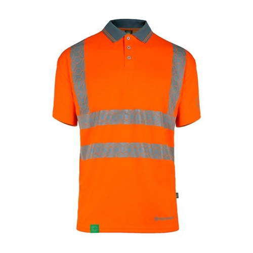 High Visibility short sleeved polo shirt made from recyclable fabric. Rpet generated from the recycling process can be made into yarn and reused for all types of polyester clothing. Made from 160gsm 100% polyester Bird eye fabric and featuring a 3 button placket and grey trim to collar and cuffs. conforms to EN ISO 20471 Class 2 High Visibility.