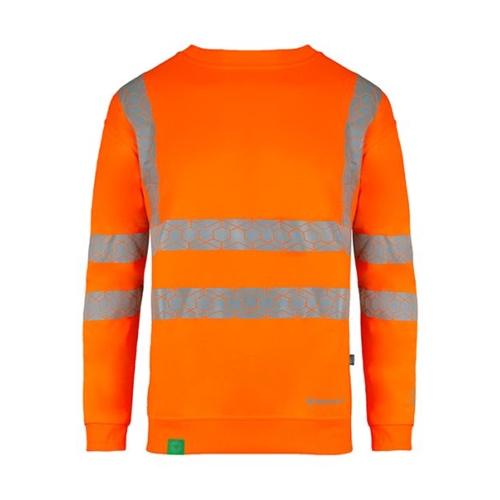 Envirowear High Visibility sweatshirt designed to be recycled, using mono-fibre design principles. rPet generated can be used in all kinds of polyester clothing and accessories. Made from 280gsm100% polyester fleece pique fabric. Features hexpatterned heatseal retro-reflective tape and 2 band and brace. Treated to prevent pilling. Conforms to EN ISO 20471 Class 3 high visibility and RIS-3279-TOM railway use certified.
