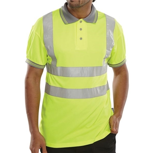 Beeswift short Sleeve High Visibility polo shirt made from 100% polyester Bird Eye fabric. Features 3 button placket, grey trim to collar and cuffs and retro-reflective tape. Machine washable at 40 degrees C up to a maximum of 25 wash cycles.