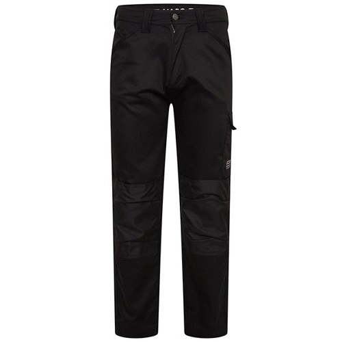 JCB Essential Black Trousers. 65% / 35% Poly Cotton Twill 245gsm. Top loading oxford polyester knee pad pockets. Left leg cargo pocket. Triple stitched flat felled seam. Two back pockets. right with Velcro pocket flap JCB reflective branding. Regular leg.