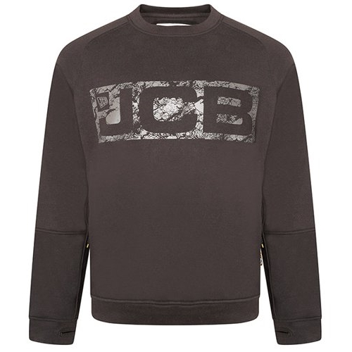 JCB Trade Crew Sweatshirt is made from 80% cotton, 20% polyester. Heavyweight, cotton rich fabric, Cordura fabric elbow patches for durability. With two side pockets with YKK zips, thumb grips sewn into cuffs, and distressed JCB branding across front chest.