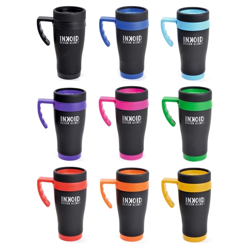 450ml black rubberised travel mug with coloured handle, trim & lid centre