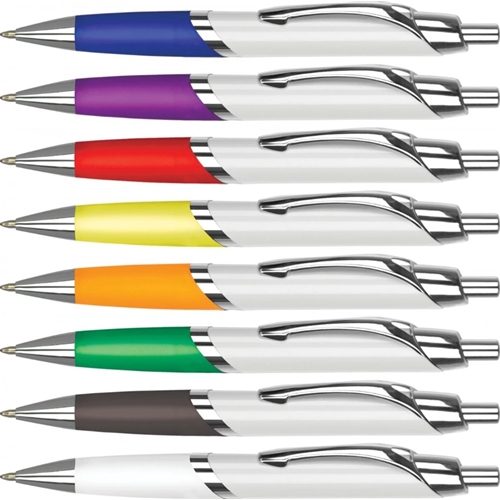 Quality push-button retractable ballpen with chrome trim and a comfortable rubber grip in a range of 8 different colours. FULL-COLOUR PRINTING is available on a 24 Hour Express Service: 1 position, max. 5000pcs.