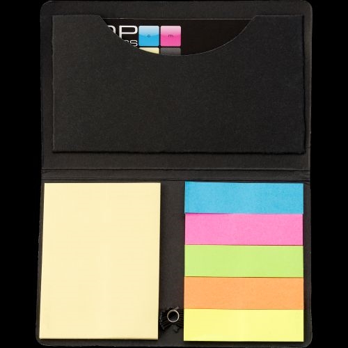 Card booklet with one hundred and fifty sticky notes and inside pocket for business cards. Can be closed with a fabric ribbon.
