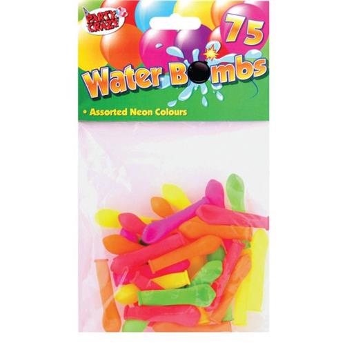 75 x Water Bomb Balloons in Assorted Neon Colours - Pack of 12. These water bomb balloons are ideal for kids party games and fun water fights. Supplied in assorted neon colours - yellow, orange, pink and green.